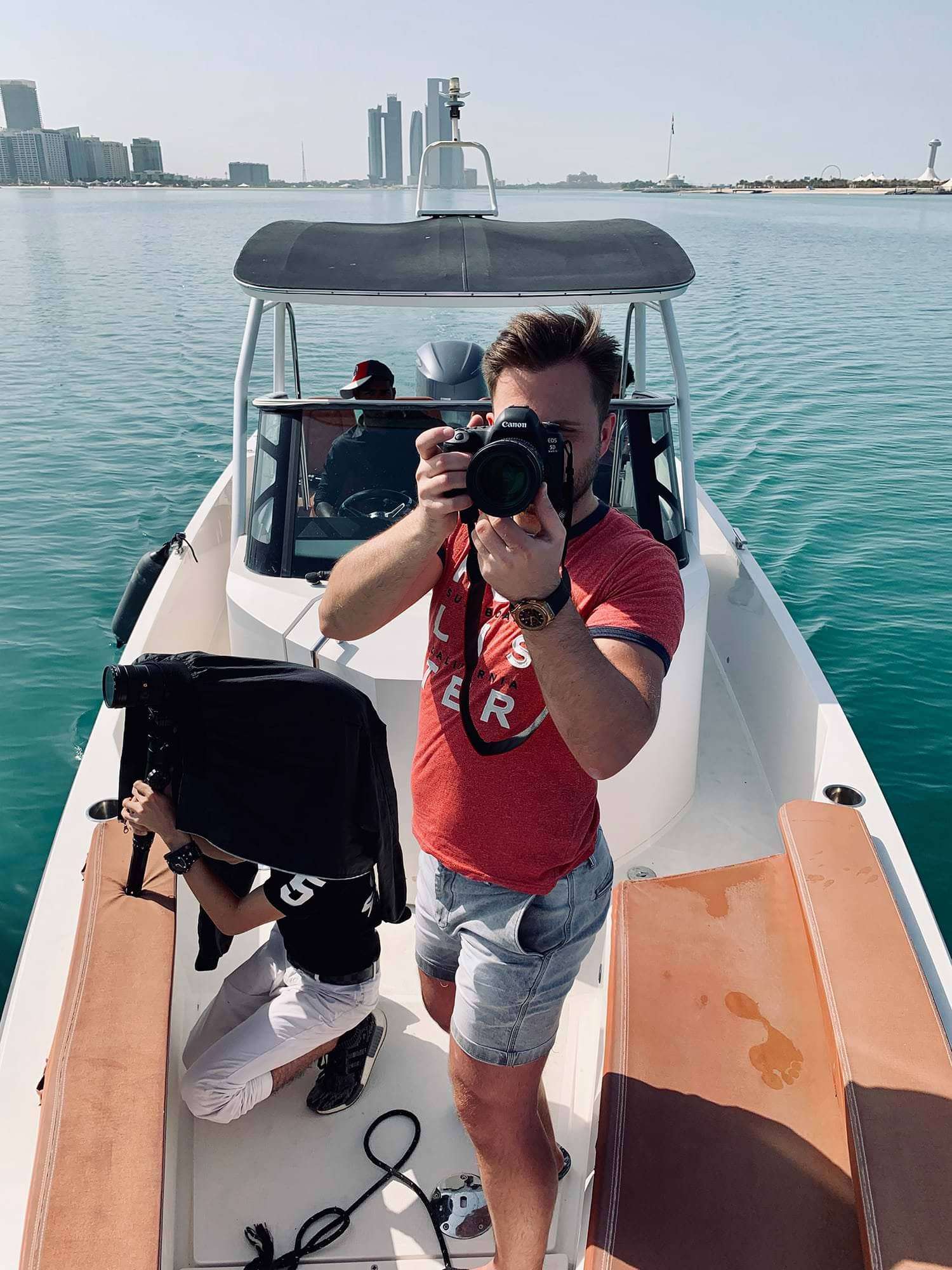 Sobald die Stewardess die Türen öffnet, merkst du, dass du in einer anderen Welt gelandet bist. Uns erwarten knapp 26°, ein Sonnenuntergang hinter den Dünen und Jimmy Pelka mit breitem Lächeln: „Jungs! Geil, dass ihr da seid!“. Nächstes Ziel – Novotel Abu Dhabi Gate. Beim Essen treffen wir auch unser Partner-Filmteam aus Indonesien, Premiere Works. Zwei freshe Jungs – Fariz und Christo. Ab da gibt es nur mehr ein Topic: Den abgefahrensten Image-Film, den du je gesehen hast!