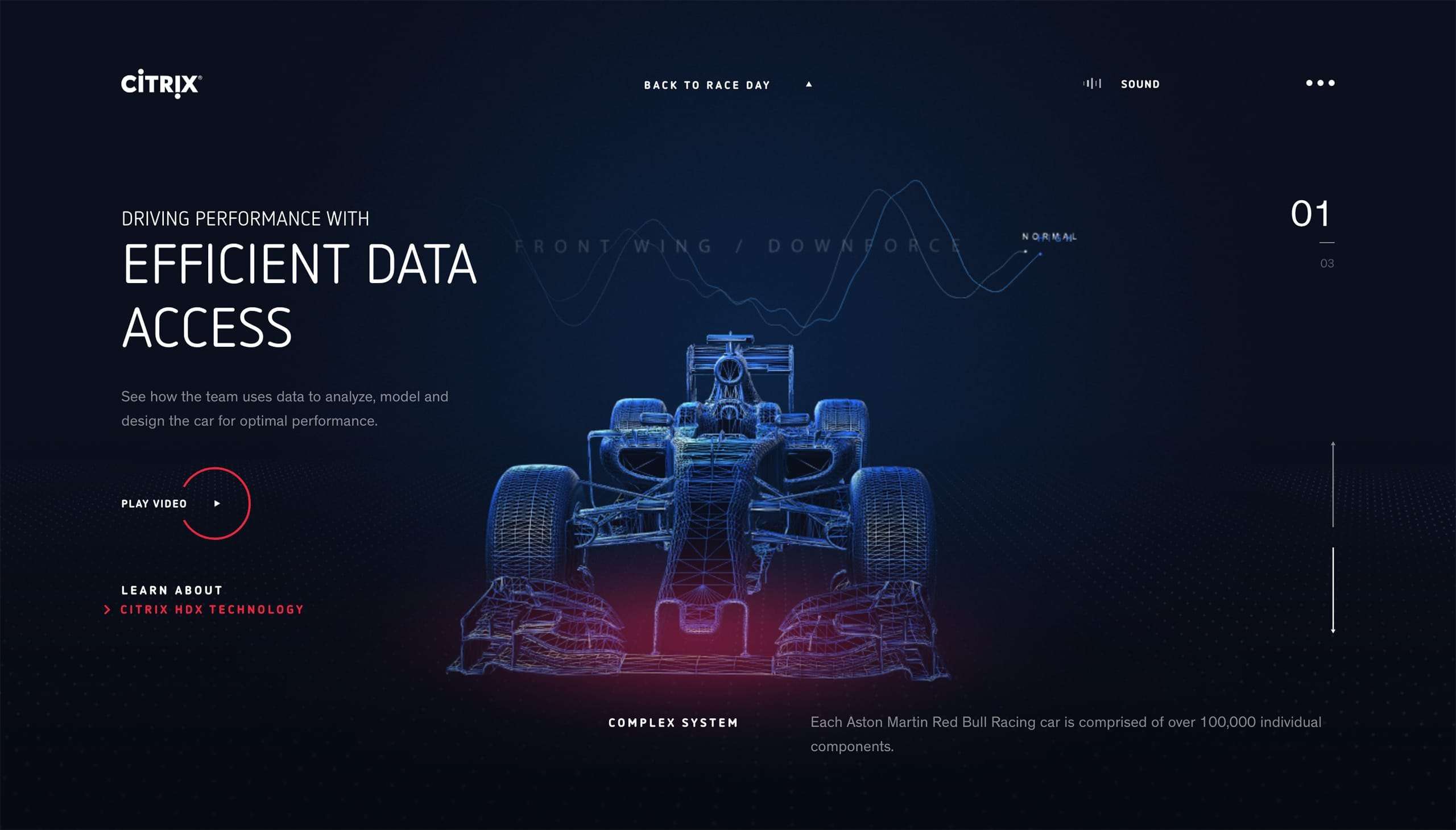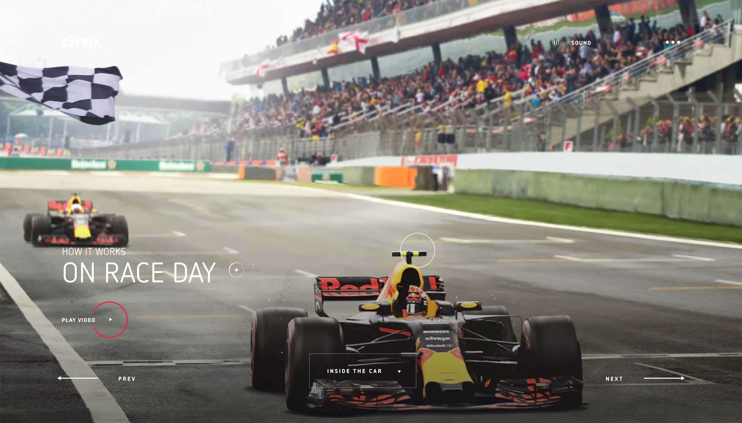 Red Bull and CITRIX show their technological partnership in the implementation of a storytelling website. The full screen images are integrated into the website as 3D elements, creating a very tangible and even dynamic atmosphere. The discreet sound elements on clicking to the next page open up a little insight for the feeling on a racetrack. The collaboration and its background are presented as visualized points with written information, which can be used to explain the contents of the website in a comprehensible way.